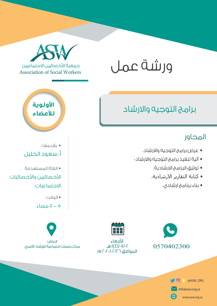تعلن جمعية الأخصائيين الاجتماعيين عن إقامة ورشة عمل بعنوان” برامج التوجيه والارشاد” يقدمها الأستاذ سعود الخليل، ماجستير علاج اجتماعي، تفاصيل الإعلان بالصورة أدناه.
