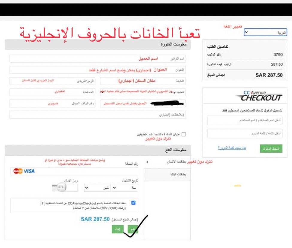 معلومات صفحة السداد، مع أهمية تعبئة الخانات باللغة الانجليزية