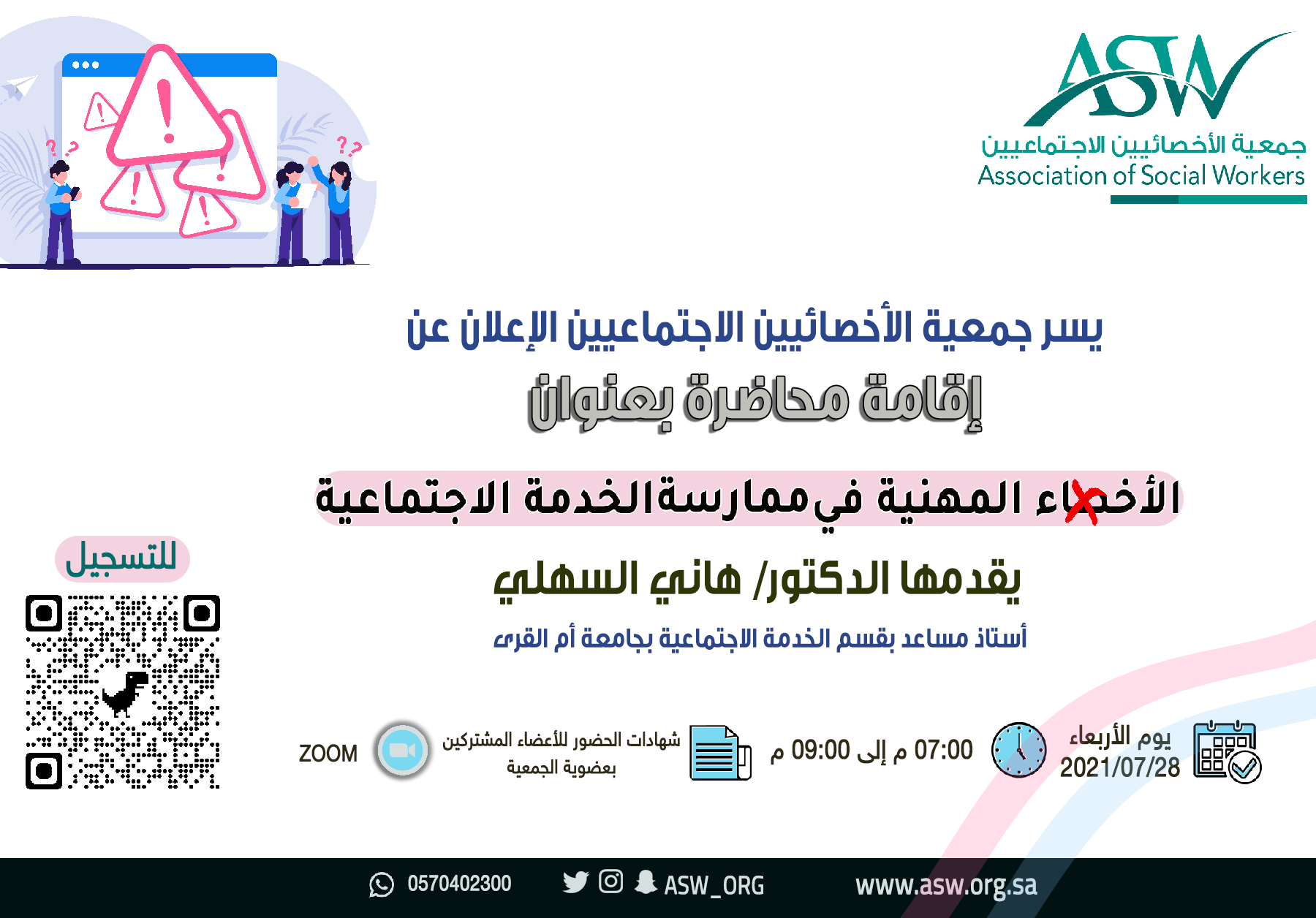 تعلن جمعية الأخصائيين الاجتماعيين عن بدء التسجيل في محاضرة: الأخطاء المهنية في ممارسة الخدمة الاجتماعية، يقدمها الدكتور هاني السهلي أستاذ مساعد بقسم الخدمة الاجتماعية بجامعة أم القرى وذلك يوم الأربعاء القادم الموافق: 2021/07/28 في تمام الساعة السابعة مساءً.