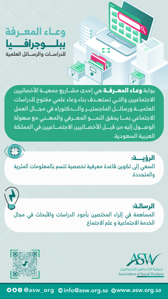 تعلن جمعية الأخصائيين الاجتماعيين عن إطلاق بوابة وعاء المعرفة وهي إحدى مشاريع جمعية الأخصائيين الاجتماعيين والتي تستهدف بناء وعاء علمي مفتوح للدراسات العلمية ورسائل الماجستير والدكتوراه في مجال العمل الاجتماعي بما يحقق النمو المعرفي والمهني مع سهولة الوصول إليه من قبل الأخصائيين الاجتماعيين في المملكة العربية السعودية.