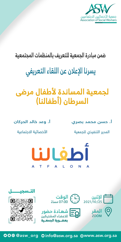 يسر الجمعية أن تعلن عن بدء التسجيل في اللقاء التعريفي عن جمعية المساندة لأطفال مرضى السرطان #أطفالنا  ضمن مبادرة الجمعية للتعريف بالمنظمات الاجتماعية، وذلك باستضافة المدير التنفيذي الأستاذ / حسن محمد بصري ،  والأخصائية الاجتماعية الأستاذة/ وعد خالد الحركان.