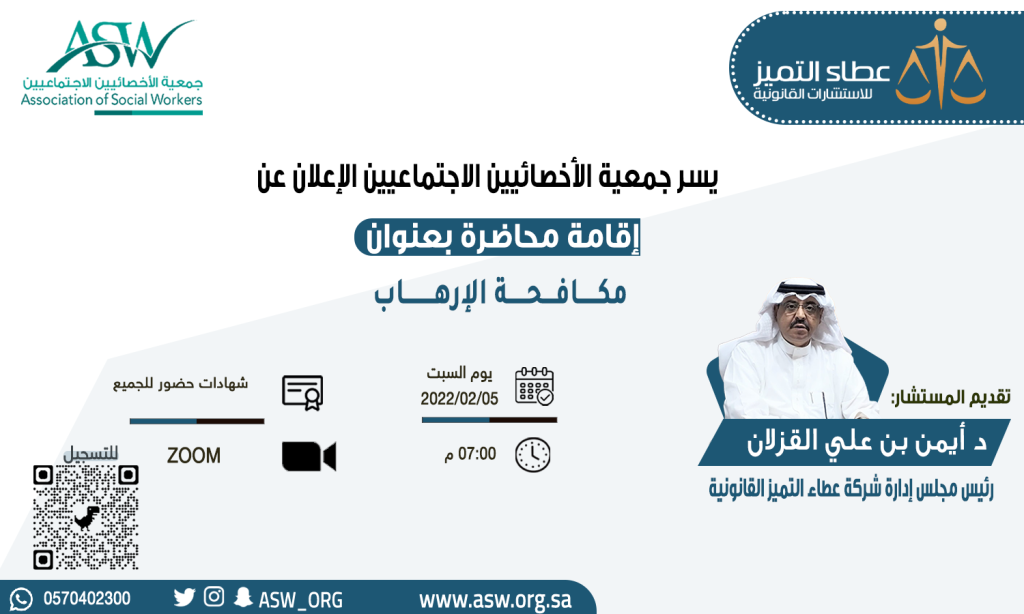تعلن جمعية الأخصائيين الاجتماعيين عن بدء التسجيل في محاضرة: مكافحة الإرهاب، يقدمها الدكتور/ أيمن بن علي القزلان رئيس مجلس إدارة شركة عطاء التميز القانونية. وذلك يوم السبت الموافق: 2022/02/05 في تمام الساعة السابعة مساءً.